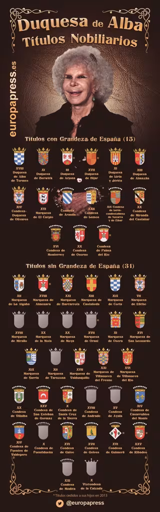 María del Rosario Cayetana Fitz-James Stuart y Silva, nombre completo de la Duquesa de Alba, que ha fallecido este jueves, ostentaba 46 títulos nobiliarios, de los que siete los distribuyó entre sus hijos a principios del pasado año.