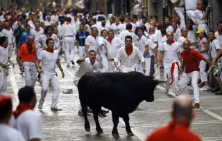 Ya en la calle Estafeta, el grupo se ha ido estirando y rompiendo y ha permitido a los mozos coger asta para protagonizar una carrera delante de los toros. Los cinco hermanos y los cabestros han tardado apenas dos minutos en llegar a los chiqueros.