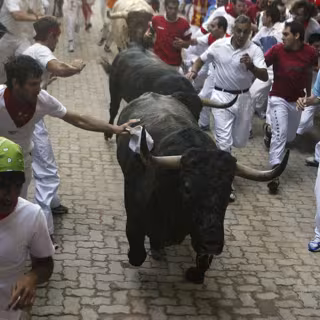 Sin embargo los momentos de más tensión y peligro se vivieron en la calle Estafeta, ya que uno de los toros resbaló justo antes de llegar a la curva de Mercaderes y se separó del resto de la manada junto a un segundo toro. Así, se quedaron por delante los cabestros y cuatro toros, mientras que más atrás seguía los otros dos.