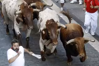 A gran velocidad, este astado ha enfilado la calle Estafeta seguido por uno de sus hermanos, negro, y han provocado los momentos de más peligros y emocionantes. En este tramo se han registrado bonitas carreras por parte de los mozos, aunque también se han visto numerosas caídas.