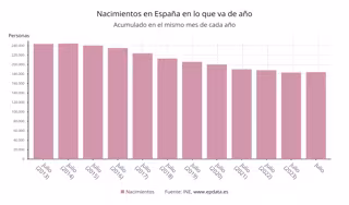 En concreto, entre enero y julio de 2024 han nacido 184.050 bebés y, a pesar del ligero incremento con respecto a 2023 (183.394 nacimientos en los mismos meses), estas cifras muestran una tendencia a la baja. Así, se contabilizaron 188.313 alumbramientos en 2022; 190.350 en 2021; 200.799 en 2020; 206.928 en 2019; 213.887 en 2018 y 224.997 en 2017.
