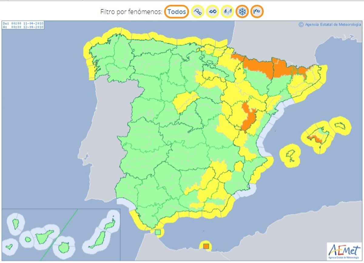 Además, los fenómenos costeros y el fuerte oleaje afectarán a buena parte del litoral. En concreto, tendrán aviso amarillo las provincias costeras galletas, Asturias, Cantabria, Vizcaya y Guipúzcoa, Barcelona, Gerona, las islas de Baleares, Alicante, Ceuta, Melilla, Almería, Granada, Málaga y Cádiz.