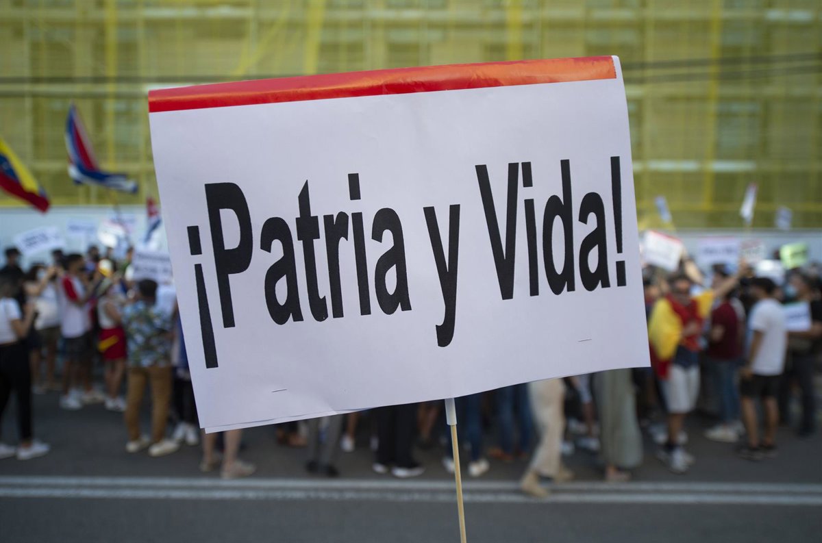 Decenas de personas durante una concentración promovida por Vox, en apoyo a las protestas en Cuba, ante la embajada de Cuba en España, a 12 de julio de 2021, en Madrid (España). La convocatoria de la protesta ha sido difundida durante el día de hoy por - Alberto Ortega - Europa Press