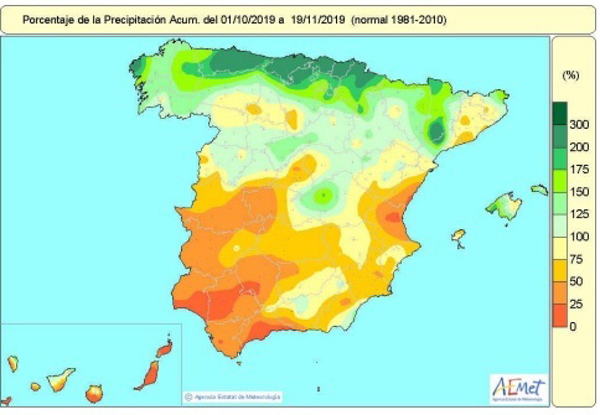Por el contrario, no han alcanzado los valores normales en toda la mitad sur de la Península, en el interior de Castilla y León y Cataluña en el sistema Central, en el sur de Aragón, en las islas Pitiusas y en gran parte de Canarias, y destaca el valle del Guadalquivir, el litoral de la provincia de Málaga, el interior de Valencia y las islas de Lanzarote, El Hierro y Fuerteventura, donde las precipitaciones no llegan al 25 por ciento del valor normal, es decir, que no han llovido ni una cuarta parte de lo normal.
