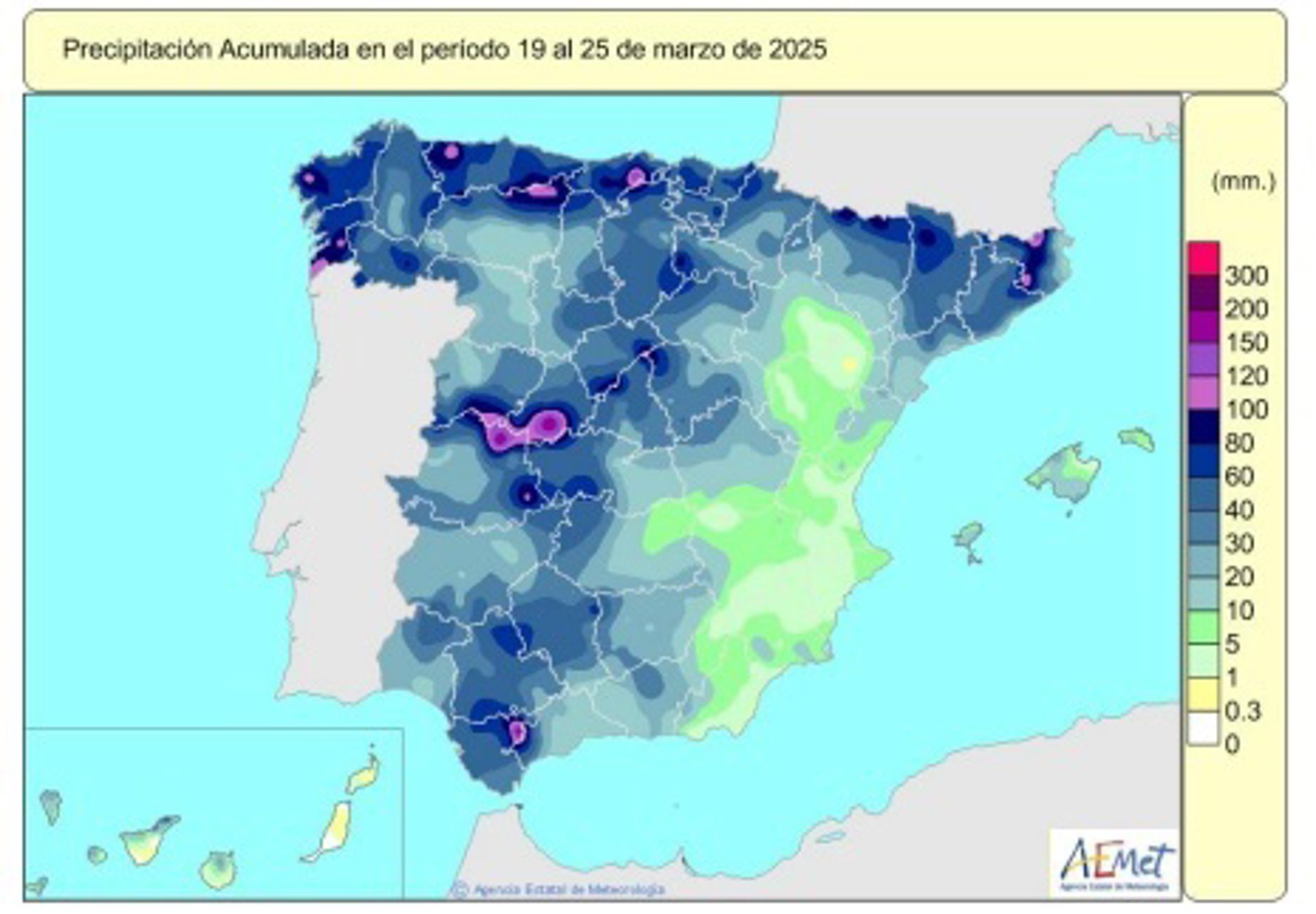 Durante el periodo del 19 al 25 de marzo las precipitaciones fueron abundantes y afectaron a todo el territorio. A lo largo de toda la Península --salvo en una franja en el levante que va desde Almería al valle del Ebro--, en Baleares y en el norte de la islas canarias de mayor relieve se superaron los 10 l/m2. De hecho, las cantidades más destacadas sobrepasaron los 100 l/m2 en puntos aislados del cantábrico y del Sistema central, en la sierra de Gredos y en la sierra de Grazalema.