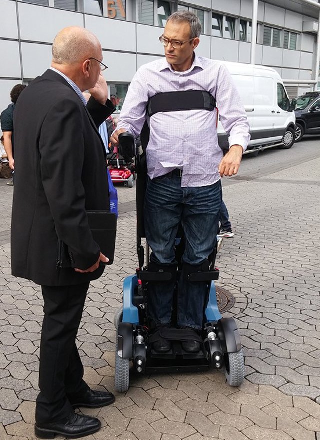 La silla de ruedas vertical está formada por una plataforma de cuatro ruedas impulsadas por un motor eléctrico similar al de un Segwey, e incluye una pequeña grúa vertical que permite poner en pie al usuario. También está equipada con anclajes que aseguran que la persona pueda articular con seguridad los movimientos.