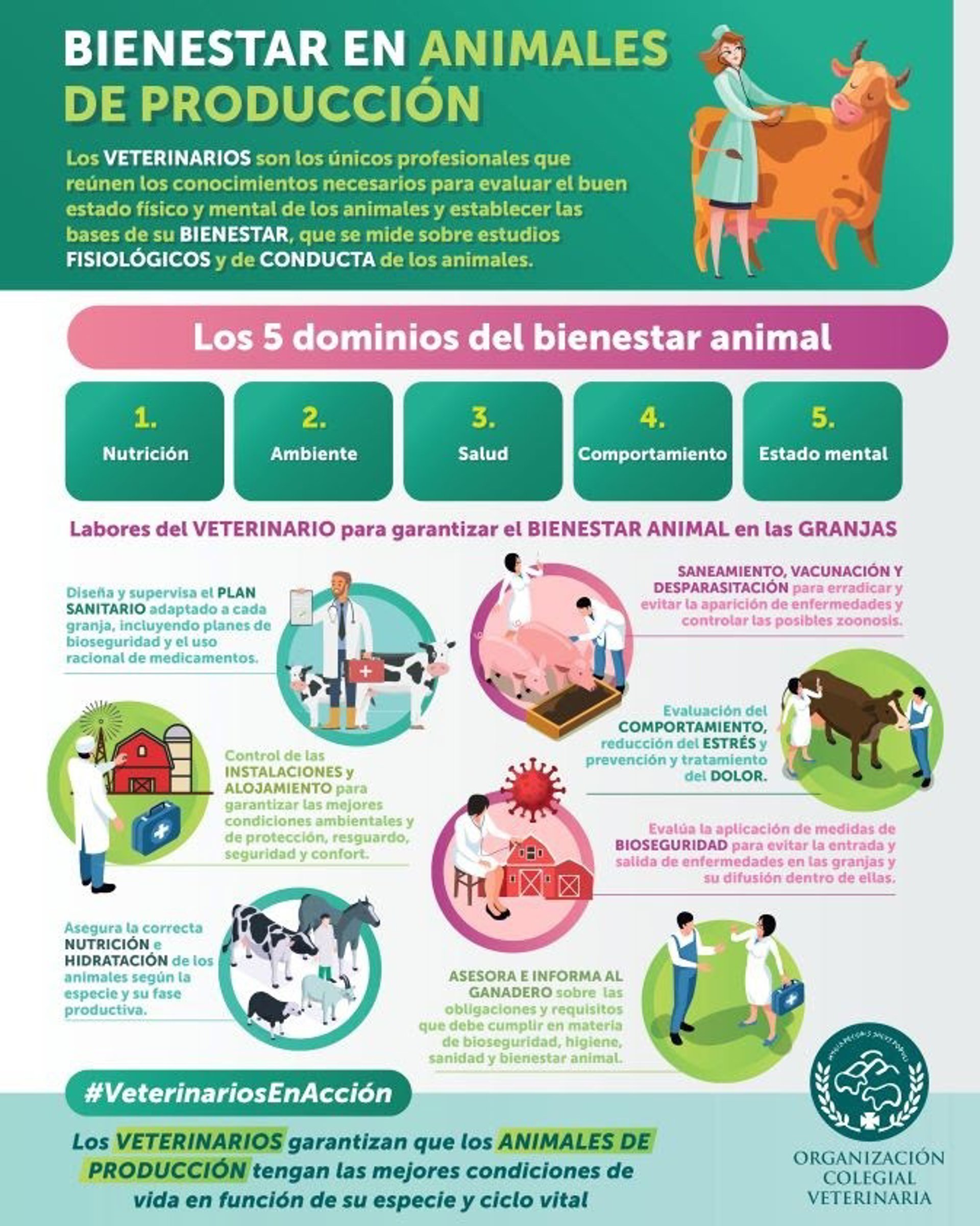 Finalmente, la organización añade que para controlar la aparición de enfermedades y controlar las zoonosis, los veterinarios establecen planes preventivos a través de la vacunación, desparasitación y saneamiento del ganado; realizan evaluaciones de comportamiento de los animales; trabajan en la reducción del estrés; y son los responsables de la prevención y el tratamiento del dolor, entre otras muchas tareas.