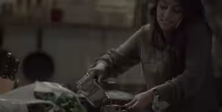 La mujer llega al hogar con bolsas de la compra, le da el billete de vuelta a su padre y le pregunta a su hijo si ha terminado los deberes. Tras ello, recibe una llamada de teléfono del trabajo, que atiende al tiempo que le prepara un té a su marido, el cuál, sentado en el sofá con un portátil, le pide con un gesto que realice la cena.