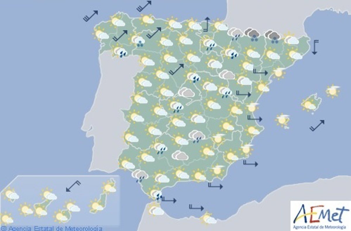 y en Baleares, donde serán de dirección variable. Podrán ser fuertes al final del día en zonas de Galicia, del área Cantábrica y del norte de Castilla y León. En Canarias los vientos serán del noreste.