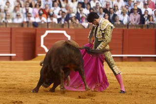 Pablo Aguado realiza una verónica al primero de su lote durante la corrida del Domingo de Resurrección en la plaza de toros de la Real Maestranza de Caballería de Sevilla, a 17 de abril de 2022 en Sevilla (Andalucía, España) - Joaquin Corchero - Europa Press