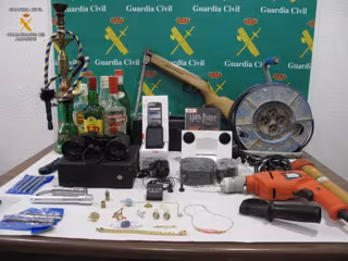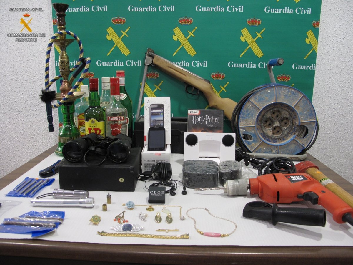 Entre ellos, se encuentra una carabina de aire comprimido, diversas joyas, una hacha, un taladro percutor con varios juegos de brocas, un teléfono móvil, unos prismáticos, dos linternas, una pipa de agua para fumar, así como cinco botellas de diferentes bebidas alcohólicas.
