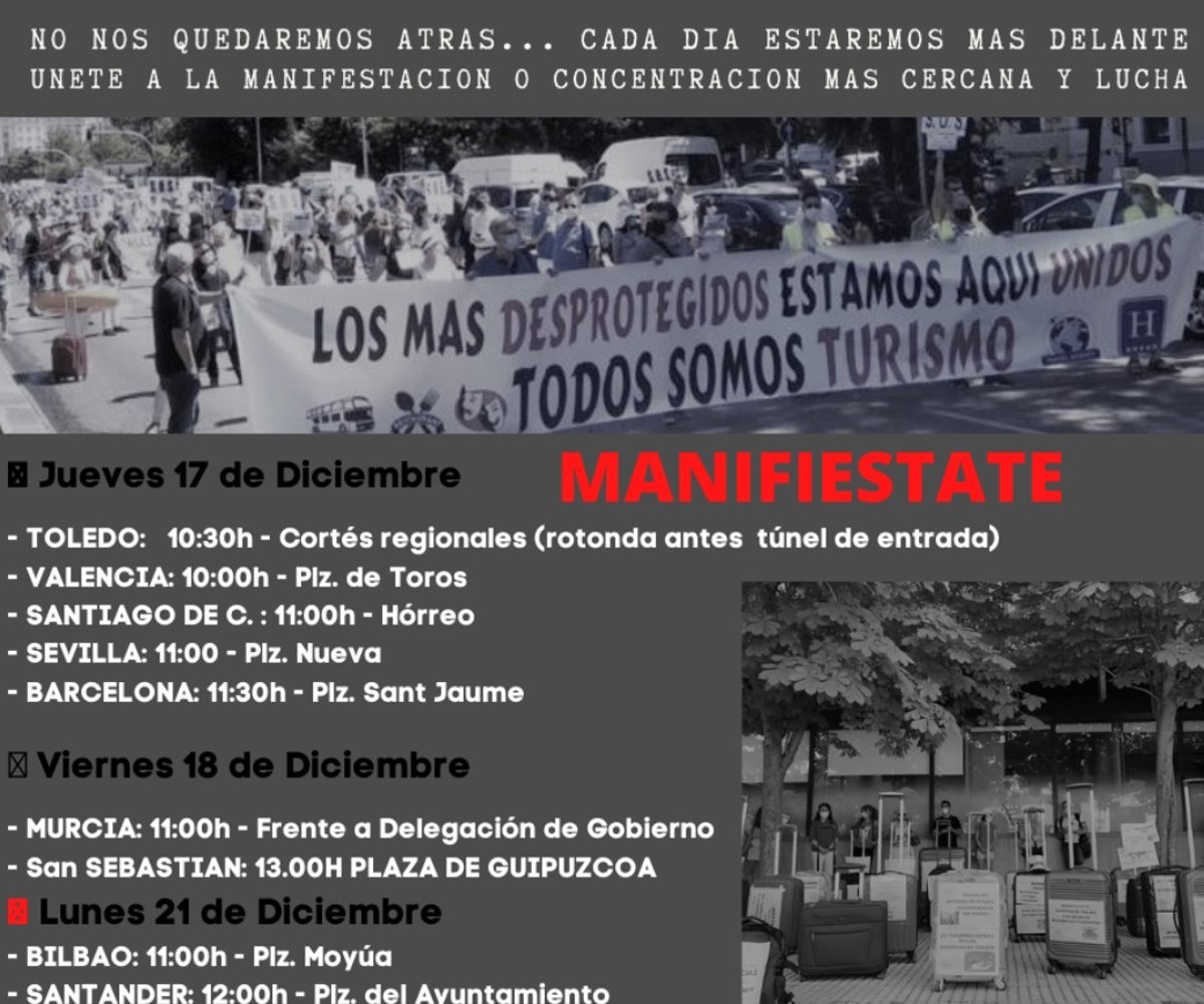 "Diciembre 2020 y continuamos sin respuesta ni la mínima atención hacia un sector olvidado y abandonado, que lo único que ha recibido es (créditos) ICO, sobrecarga para los que llevamos más de un año sin ventas, sin ingresos y con pérdidas constantes, (aproximadamente 30-40 millones euros de pérdidas por agencia) pero gastos al 100% y cese/ERTE, lo cual es insuficiente para mantener nuestras familias y negocios, ya que esa cantidad es con la que hacemos frente a los gastos e impuestos obligatorios y fijos mes a mes" reza su manifiesto.