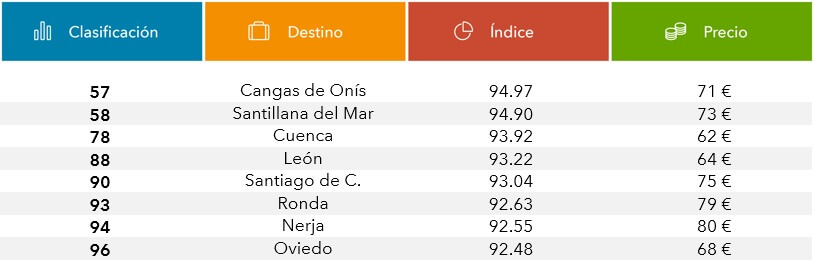 Los destinos españoles, pese a tener muy buena valoración, se encuentran en la segunda mitad de la tabla por presentar precios algo más elevados que el resto. Cangas de Onís se sitúa en cabeza de los españoles en cuanto a reputación (94,97 puntos con un precio medio de 71 euros), mientras que Cuenca es el más económico, con 62 euros de media.