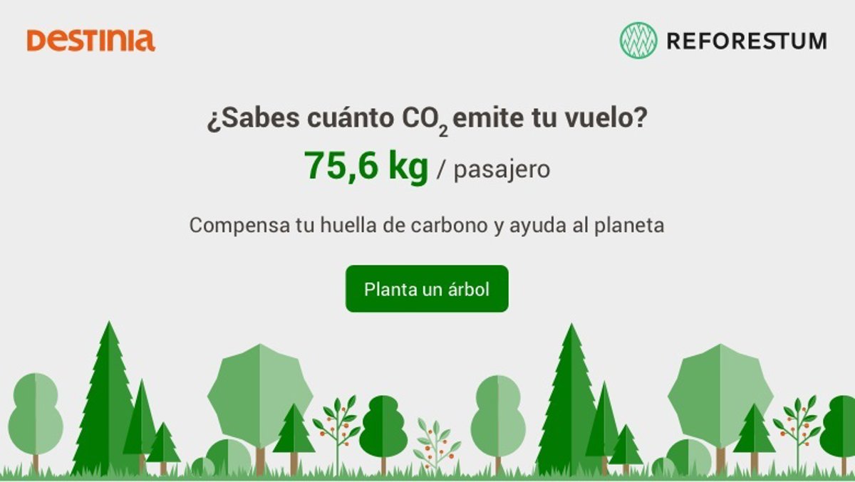 Por cada billete de avión el cliente recibirá en su bono de compra la información detallada de los kilos de CO2 emitidos y si está interesado en compensar ese impacto, desde Destinia le redirigen a Reforestum.