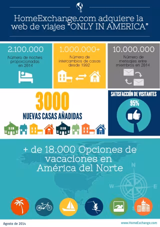 HomeExchange.com, fundada en 1992, sigue así su plan de expansión, tras la adquisición en enero de Aha! Go, una web de intercambio de casas para las vacaciones como parte de su plan de expansión que contempla la adquisición de entre dos y cuatro páginas web de intercambio de viviendas cada año.