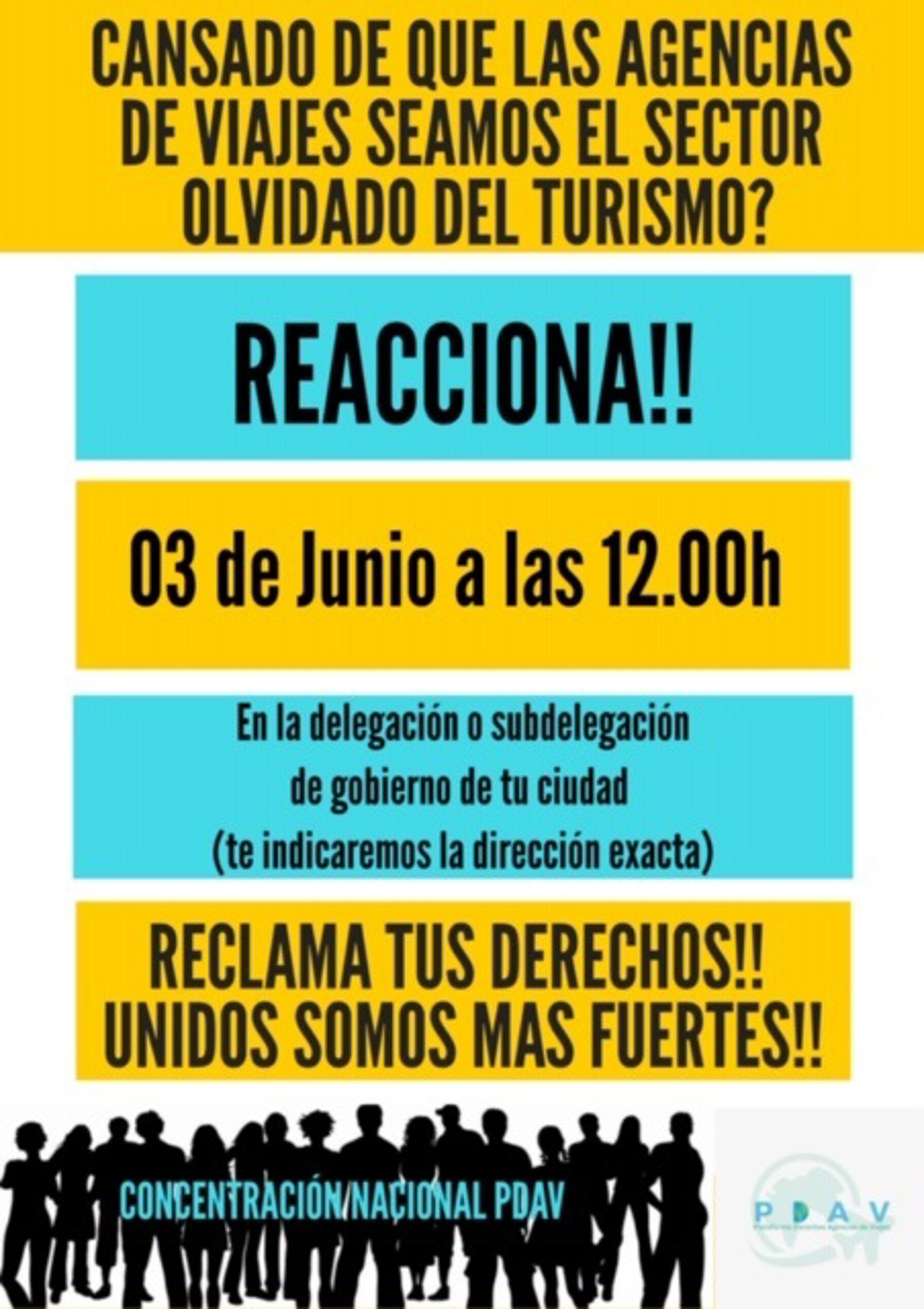 La Plataforma por los Derechos de las Agencias de Viajes (PDAV) ha convocado para este miércoles concentraciones en todas las capitales de provincia de España para reclamar un plan al Gobierno ante el impacto de la crisis del Covid-19 en los negocios del sector.