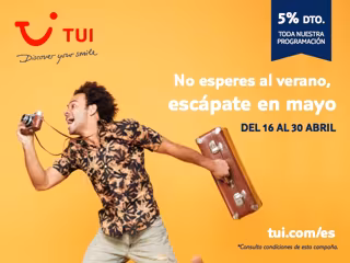 TUI quiere adelantarse al verano con su última campaña 'No esperes al verano, escápate en mayo', lanzada hoy, con la que ofrece un descuento del 5% en toda su programación en las reservas realizadas, del 16 al 30 de abril, ambos incluidos.
