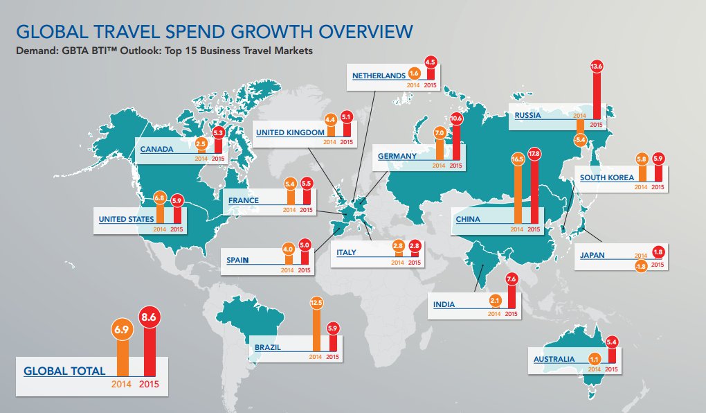 A nivel mundial, se espera un aumento medio del 6,9% del gasto en viajes de empresa para 2014 y del 8,6% para el próximo año, impulsado por la demanda de los países emergentes como China (16-17%), India (2,1-7,6%) y Brasil (12,5-5,9%).