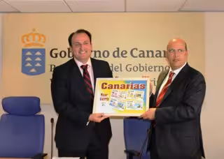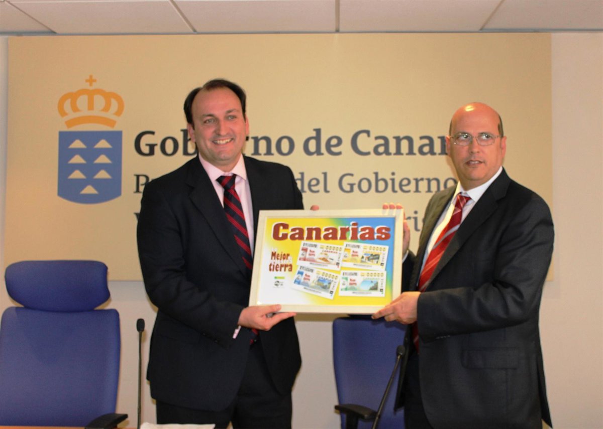Las imágenes de estos cuatro cupones han sido recogidas en una lámina ilustrativa que el delegado territorial de la ONCE, José Antonio López, ha entregado al viceconsejero de Turismo del Gobierno de Canarias, Ricardo Fernández de la Puente Armas.