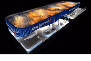 También cuenta con un techo realizado mediante elementos textiles de desarrollo vertical que actuarán como reflectores de las pantallas con tecnología. Precisamente, el stand de las islas dispondrá de 190 pantallas led situadas sobre la cubierta, proyectados para dar un movimiento ondulante simulador de ondas marinas de tonos cambiantes, así como con un pavimento de color blanco arena en alusión a las playas de las islas.