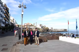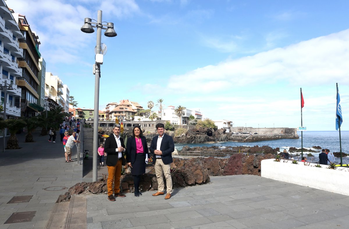 El consejero del área Tenerife 2030, Antonio García Marichal; el consejero de Turismo, Alberto Bernabé y la concejal de Turismo de Puerto de la Cruz, Dimple Melwani, visitaron este miércoles el paseo de San Telmo, donde está ubicado uno de los puntos gratuitos ubicados en la ciudad turística.