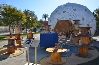 El monumento presenta forma de esfera geodésica icosaédrica, de ocho metros de diámetro, diseñada por el profesor Pedro M.Cabezos, y está recubierta con una piel compuesta de planchas de madera contrachapada que actúa como un tamizador que por la mañana proporciona un juego de luz y sombras en su interior, mientras que por la noche deja escapar la luz artificial hacia el exterior.
