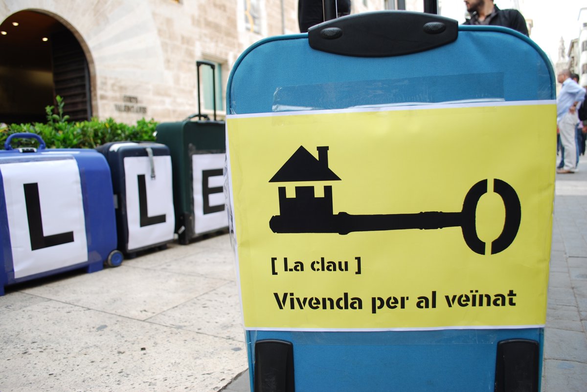 Han colocado una fila de maletas en las que podía leerse "esta ley nos echa de casa", aludiendo a los efectos en distintos barrios del proceso de "turistificación" de València. Mijo Miquel, promotora de la acción, ha señalado que el gobierno del Botànic "debe mostrar que está con las necesidades de los vecinos en materia de vivienda y no en promover la especulación inmobiliaria y la turistificación de la ciudad".