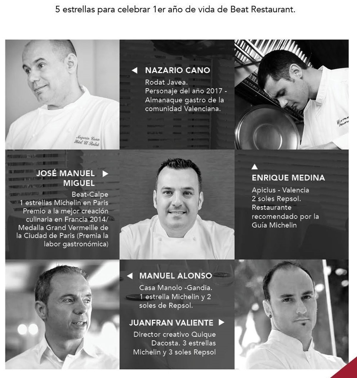 Manuel Alonso, chef del restaurante galardonado con una estrella Michelin 'Casa Manolo' en València; Enrique Medina, de Apicius, con dos soles Repsol también en València; Nazario Cano, del Rodat de Jávea y elegido personaje del Año en 2017 por el almanaque gastro de la Comunitat Valenciana; y, Juanfra Valiente, director creativo del tres estrellas Michelin Quique Dacosta, en Dénia han elaborado junto a Juan Manuel Miguel un menú "a diez manos que podrá disfrutarse por 100 euros por persona con maridaje".