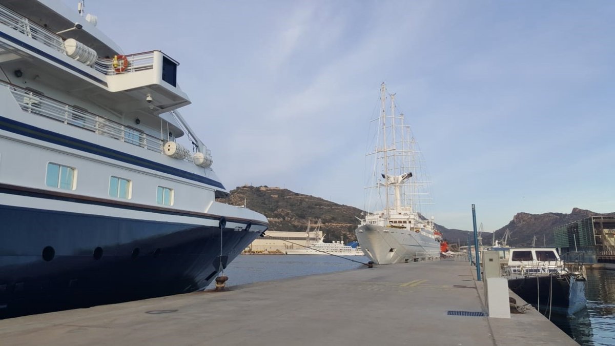 El 'Wind Surf', considerado como uno de los barcos a vela más grandes de su clase, hace escala en Cartagena junto con el buque Seadream. Sus 300 pasajeros disfrutan a bordo de esta embarcación de unas vacaciones por el Mediterráneo en un ambiente familiar, personalizado y muy marinero.