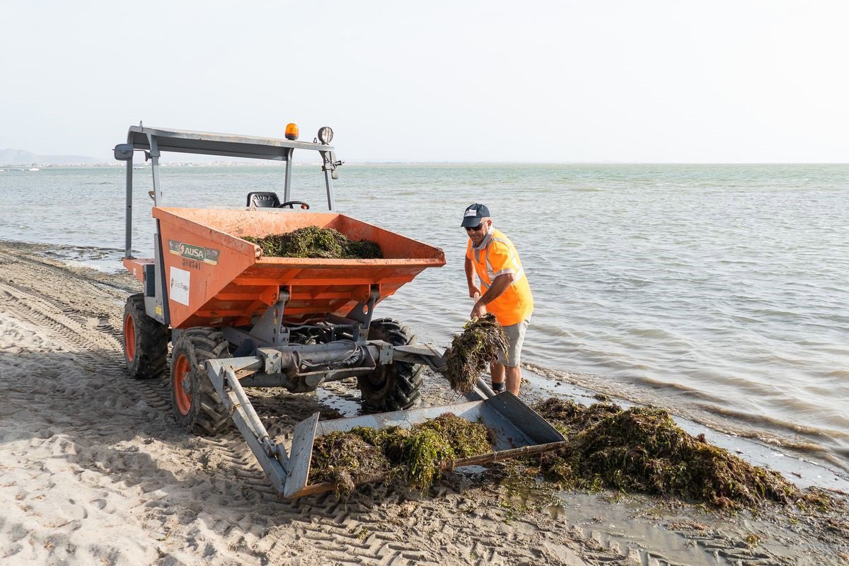 Con este motivo, las labores manuales han dado comienzo en las playas de Punta Brava, Los Nietos y Los Urrutias, donde el personal del Ayuntamiento ha intensificado su colaboración con la empresa TRAGSA contratada por la Comunidad Autónoma de la Región de Murcia para realizar estas tareas.