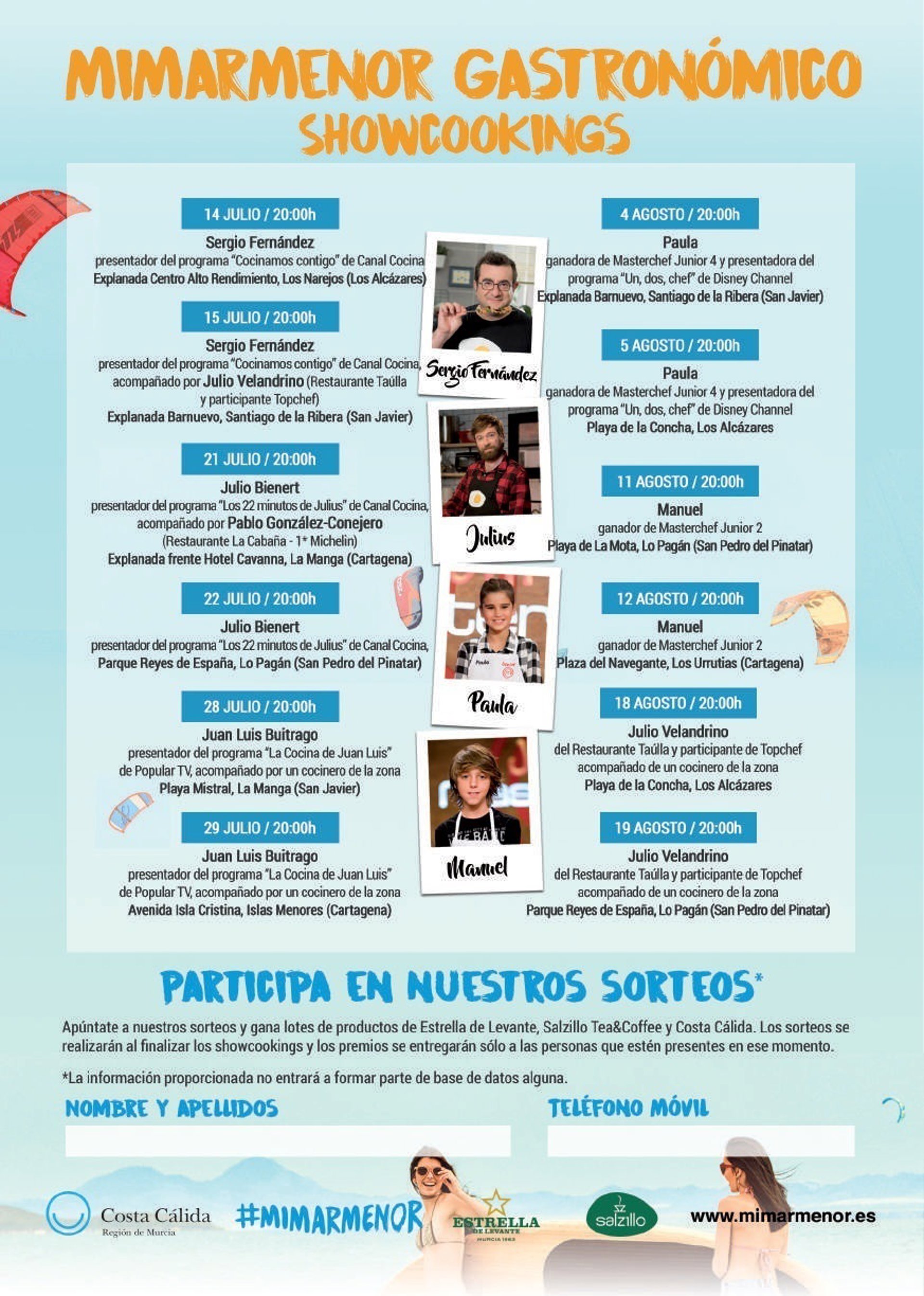 También en Los Alcázares, en la playa de La Concha, cocinarán Paula, ganadora de 'MasterChef Junior 4' (5 de agosto), y el murciano Julio Velandrino, del Restaurante Taúlla y participante de 'TopChef' (18 de agosto).