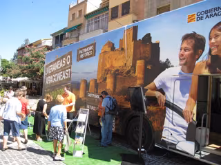 La Comunidad aragonesa promociona su oferta turística en La Rioja con un autobús instalado en el centro de Logroño gracias a un convenio suscrito entre ambas regiones para reforzar su colaboración en turismo.
