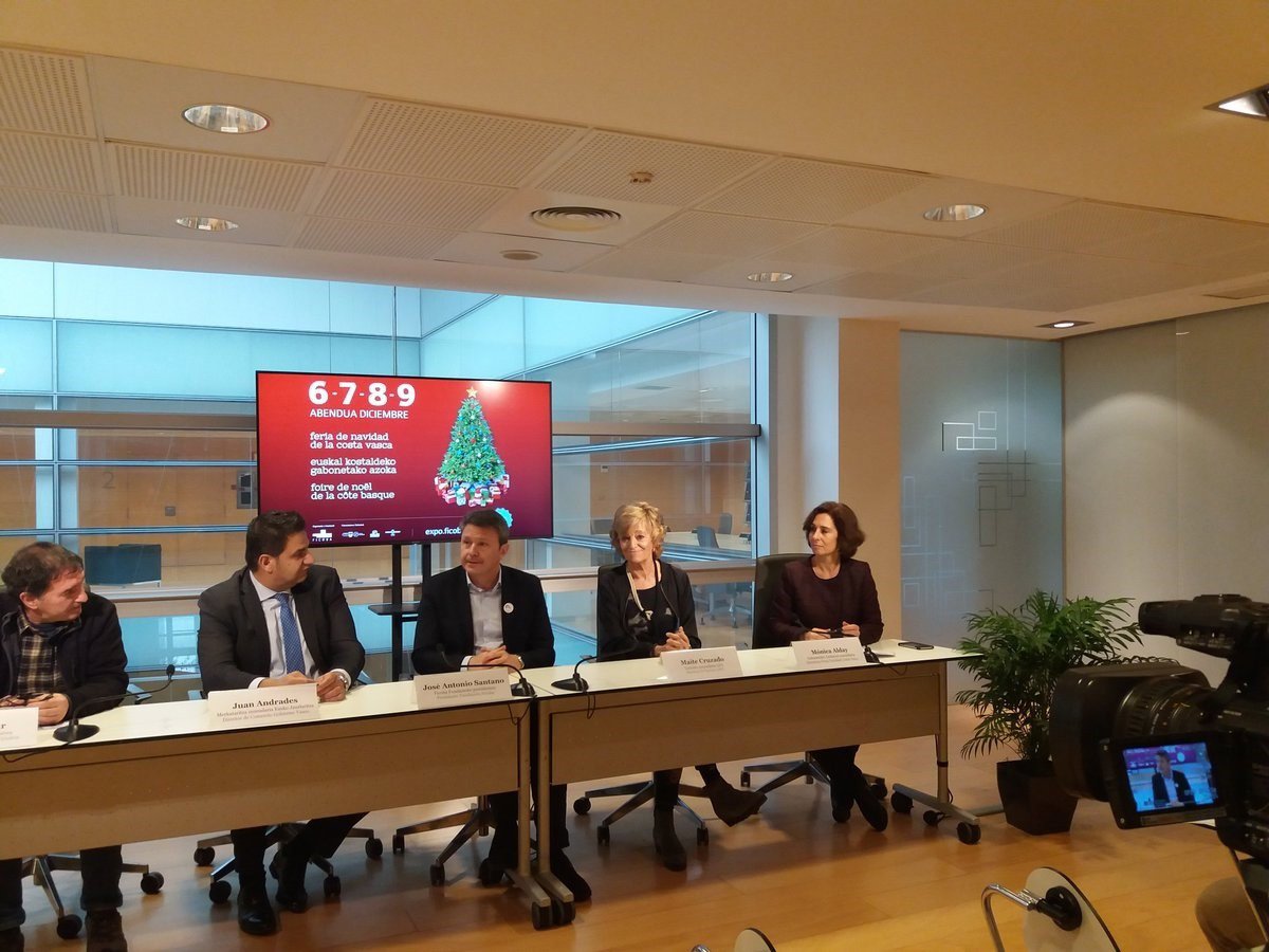 El alcalde de Irun y presidente de Fundación Ficoba, José Antonio Santanto, la directora foral de Turismo, Maite Cruzado, el director de Comercio del Gobierno Vasco, Juan Emilio Andrades, el representante de Gabiltza Juanjo Ucar, y la directora de la Feria de Navidad, Mónica Alday, han presentado en rueda de prensa los detalles de la edición 2018.