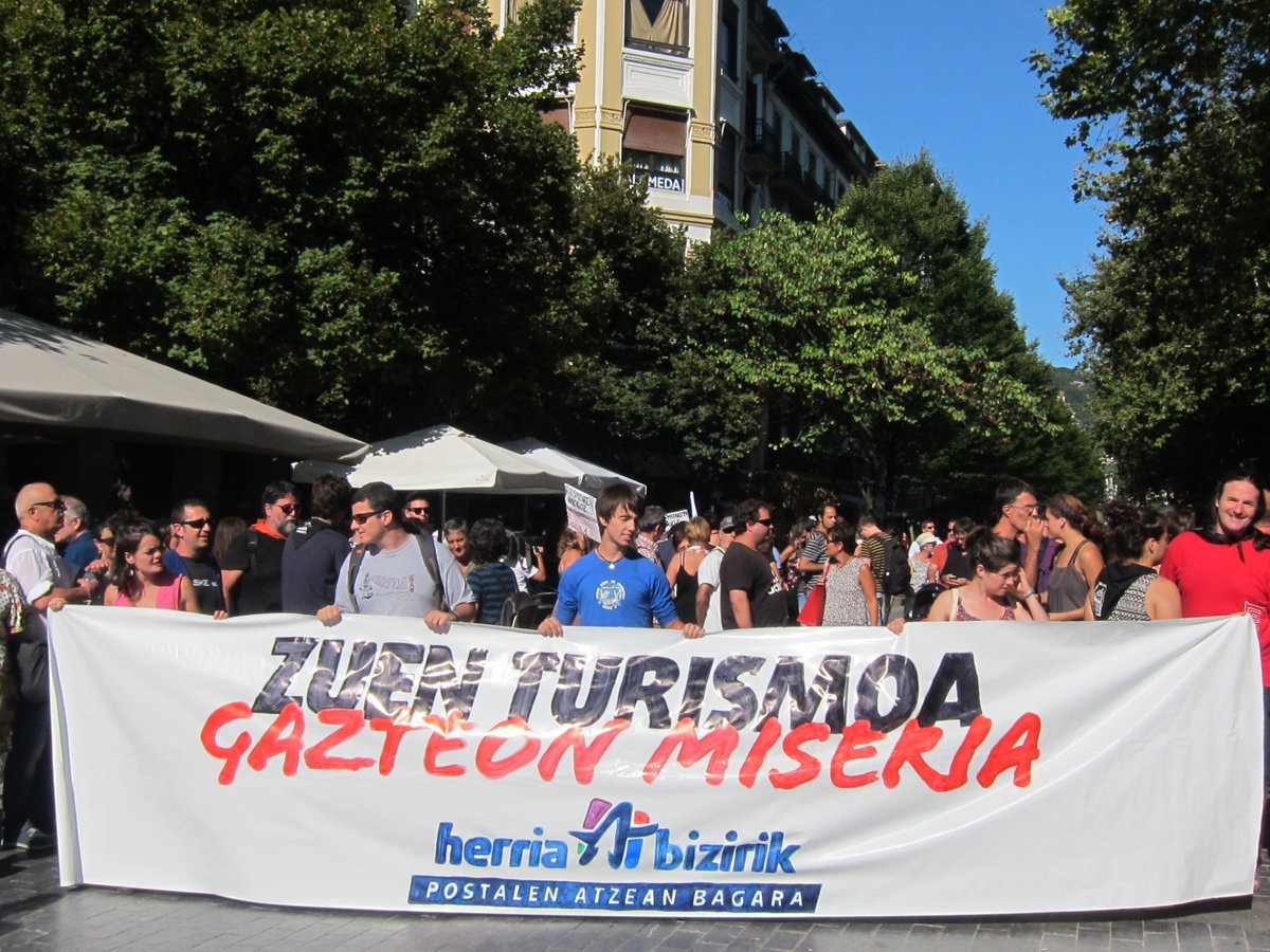 Varios cientos de personas han tomado parte este jueves en San Sebastián, que celebra sus fiestas de Semana Grande, en la manifestación convocada por las juventudes de Sortu, Ernai, contra un modelo de turismo que "solo beneficia a unos pocos", bajo el lema 'Vuestro turismo, nuestra miseria' en una pancarta.