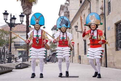 Al otro lado de la península, en Ourense, merece la pena descubrir "el entroido", un carnaval con nombre propio, de los más famosos de galicia. Se conoce por sus Cigarrones, unos personajes que llevan una máscara de madera pintada con colores llamativos, unidas a prolongaciones de metal con motivos de animales. Visten camisolas blancas bordadas con hilos dorados y desfilan junto a carrozas y comparsas a la vez que celebran la alegría en una batalla de harina. El alojamiento ideal es el Parador de Verín, que nos hace viajar a antigua Galicia. Con su estructura de típico pazo gallego, este parador se sitúa frente a la fortaleza de Monterrei, en lo alto de una colina y atesora unas vistas increíbles sobre la localidad oresana.