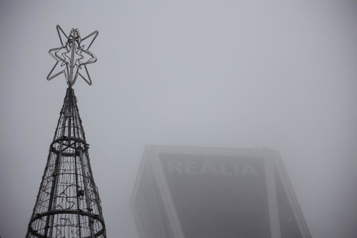 Un árbol de Navidad al lado de una de las 'Torres KIO' cubierta de niebla - Alejandro Martínez Vélez - Europa Press