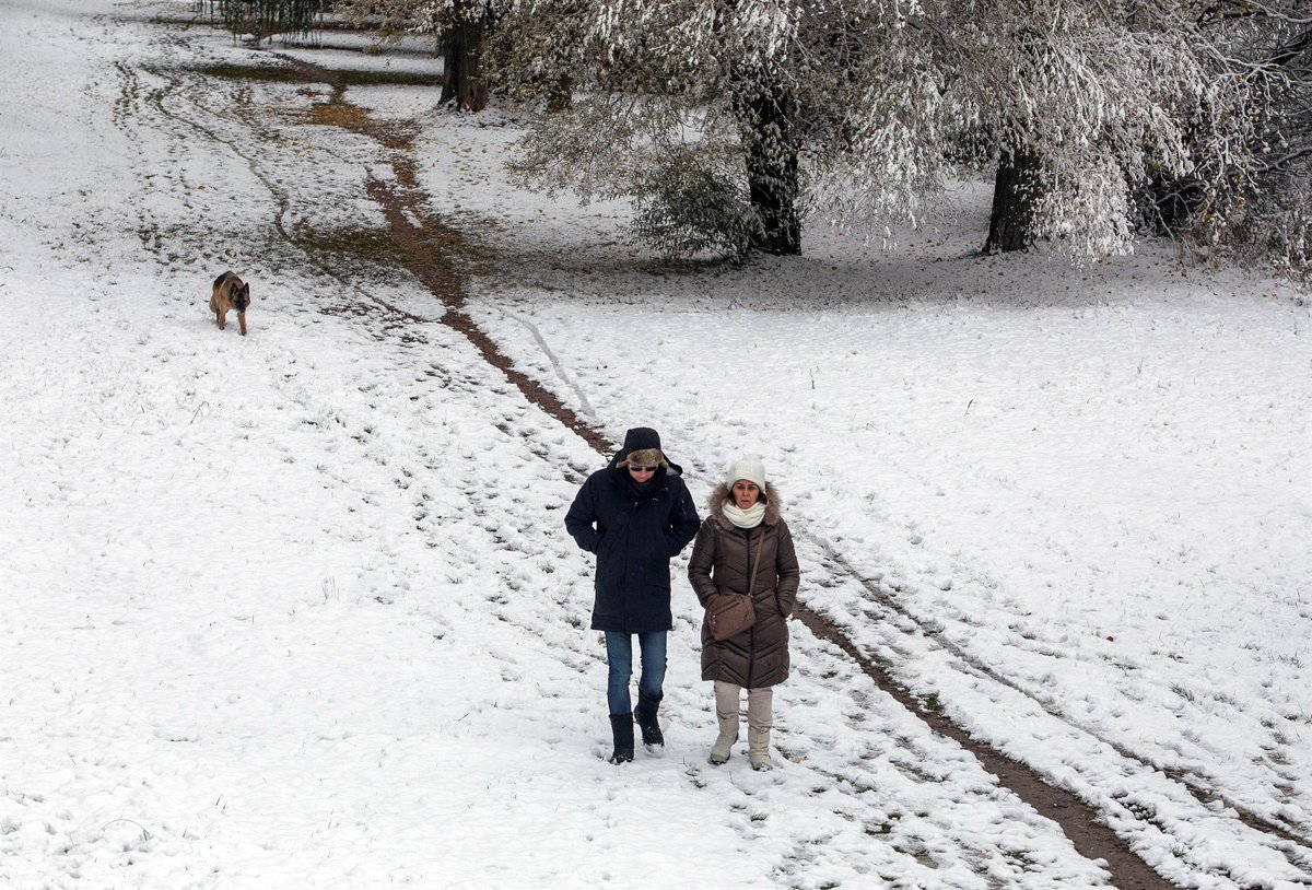 Dos personas caminan sobre la nieve, a 28 de noviembre de 2021, en Burgos, Castilla y León (España). Un total de 31 provincias se encuentran bajo diferentes niveles de riesgo por nieve, lluvia, viento, fuerte oleaje, deshielo y temperaturas mínimas, seg - Tomás Alonso - Europa Press