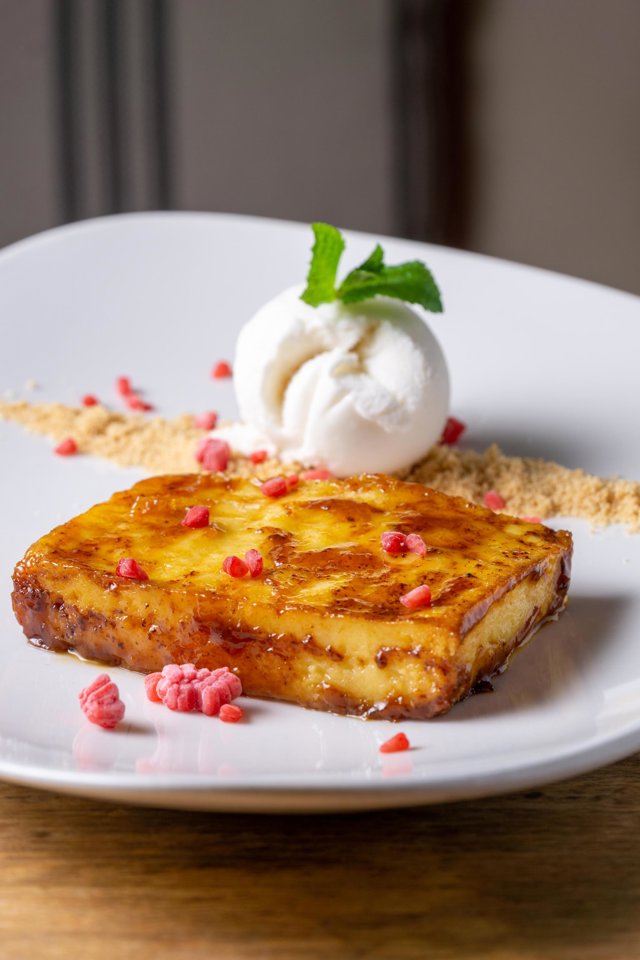 En Casa Orellana (c/Orellana, 6), Guillermo Salazar en su interpretación de la tradición y el sabor castizo habitual en su local, nos lleva a la infancia más golosa con este postre de pan de brioche, acompañadas de helado de turrón.