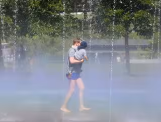 Archivo - Un hombre con su hijo pasa por los chorros de agua de la playa de Madrid Río, a 24 de mayo de 2024, en Madrid (España). Durante la visita, el alcalde ha comprobado cómo se activa esta instalación para combatir la llegada del calor. - Marta Fernández Jara - Europa Press - Archivo