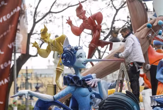 Un empleado trabaja en el último montaje de la falla Na Jordana durante la celebración de las Fallas de Valencia 2022 - Rober Solsona - Europa Press