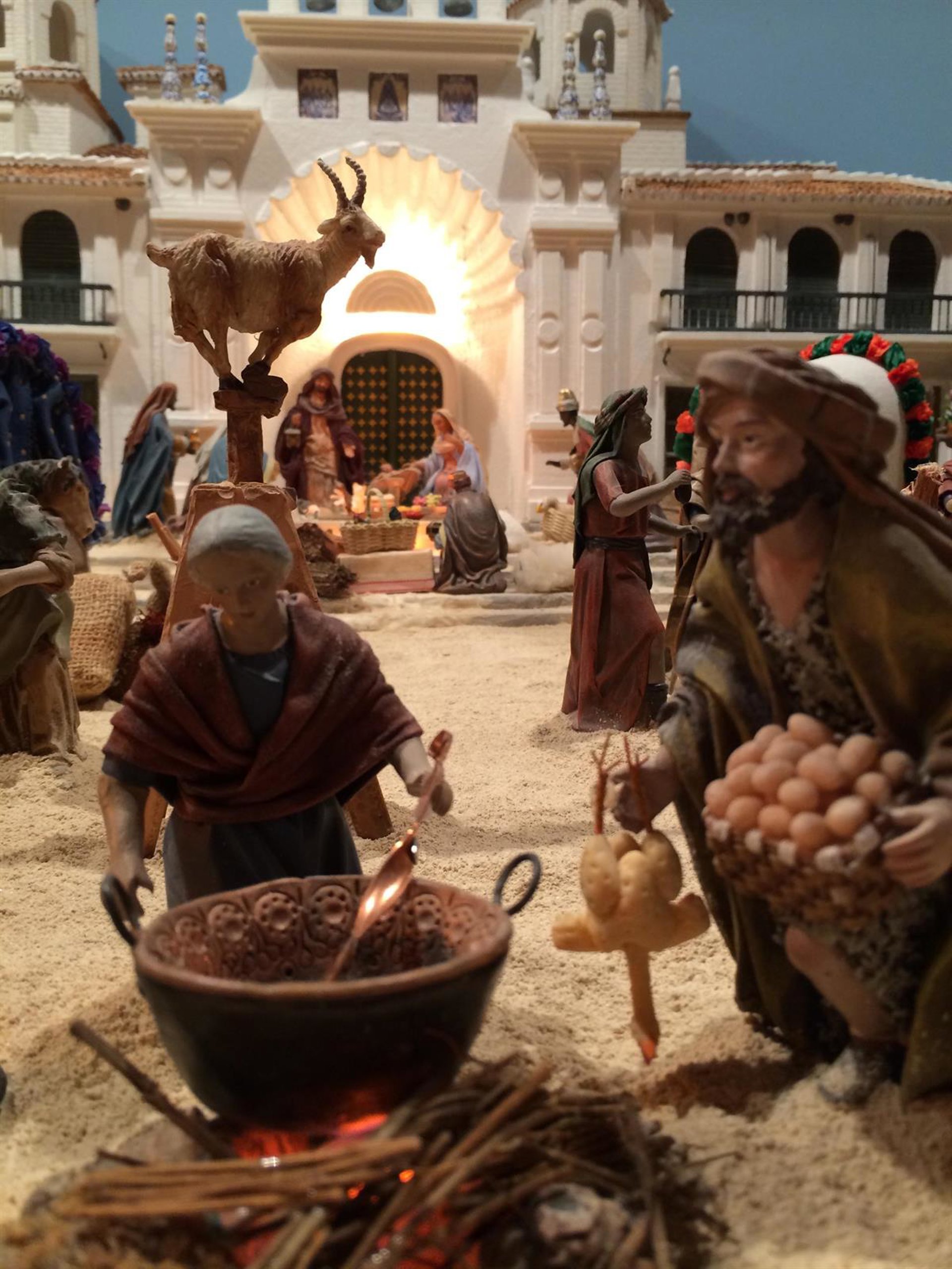 La originalidad de este peculiar belén no sólo radica en "los inéditos escenarios" que acoge, sino también en las numerosas escenas costumbristas andaluzas que se recrean en él. Así, es posible encontrar cerámica típica granadina, agricultores vareando los olivos o incluso ver a San José y María en las Alpujarras granadinas preparando chorizo y morcilla en la tradicional matanza.
