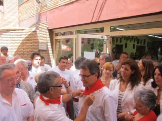 Mas ha sido recibido por el presidente de la entidad, Victoriano Verano, quien le ha agradecido que hubiera aceptado la invitación y le ha atado al cuello el tradicional pañuelo rojo.