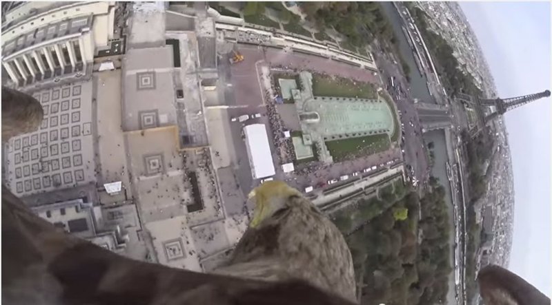 El vídeo muestra desde una perspectiva asombrosa el vuelo de una águila de cola blanca volando sobre las calles de París, desde lo más alto de la Torre Eiffel hasta los jardines del Trocadero en un impresionante picado final.