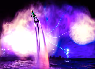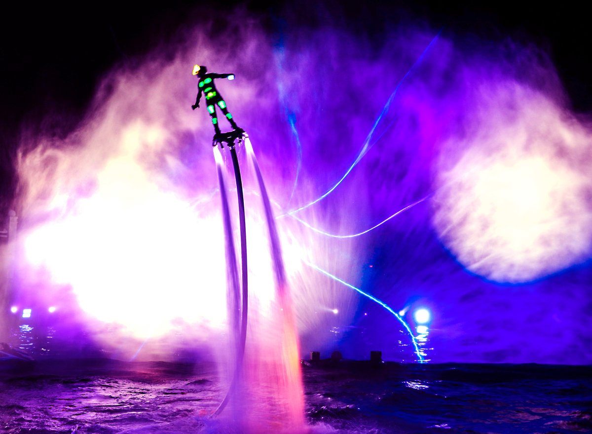 'Aquaman Nighttime Spectacular' es un espectáculo nocturno, desarrollado dentro de una superficie de 6.000 m2 con la experiencia visual entre el cielo y el agua. Equipados con trajes led programables y efectos especiales, los especialisras consiguen volar hasta los 20 metros de altura y sumergirse en el agua aprovechando al máximo las posibilidades que ofrece el flyboard.