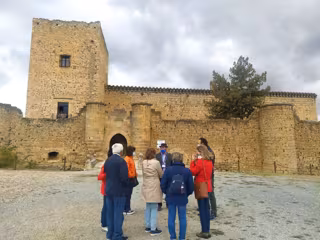 Uno de los guías del programa 'Viajero yo te enseñaré Segova' con los participantes en la visita a las puertas del Castillo de Pedraza. - DIPUTACIÓN DE SEGOVIA