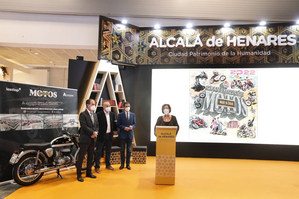 El alcalde de Alcalá de Henares, Javier Rodríguez Palacios, acompañado del primer teniente de alcalde, Miguel Ángel Lezcano, y de la concejala de Cultura y Turismo, María Aranguren, ha presentado este miércoles en Fitur la exposición 'Moto made in Spain', que ya han visitado más de 2.500 personas.