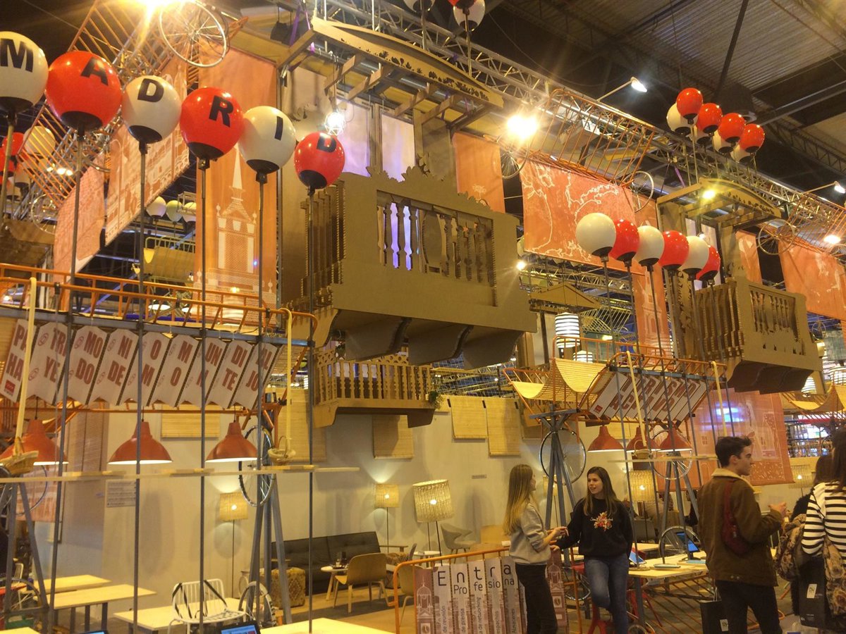 La Comunidad de Madrid ha elegido para su stand a la arquitecta Izaskun Chinchilla que con vallas metálicas, partes de bicicletas, cartones, telas y maderas, todo material reciclado y reutilizable, ha creado un gran contenedor cultural de todo lo que ofrece Madrid inspirado en el mercado callejero del Rasto.