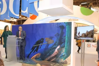 "Treinticinco kilómetros de playa dan para mucho", afirmó Francisco García durante su intervención en Fitur, acompañado de Carmen Reverte, secretaria general de la Consejería de Turismo.