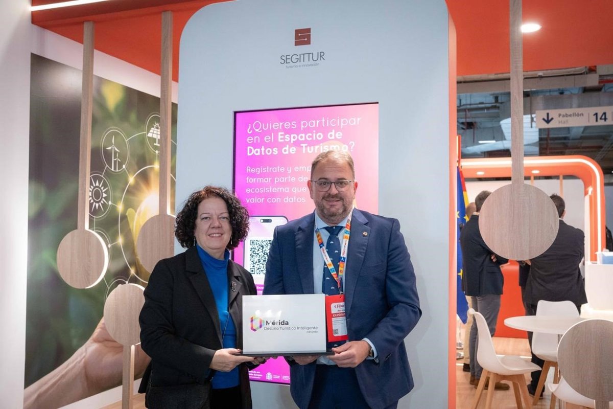 El alcalde de Mérida, Antonio Rodríguez Osuna, ha recogido este jueves, día 22, en el stand de Segittur en Fitur, en Madrid, el distintivo de Destino Turístico Inteligente Adherido 2026-2028 al programa DTI promovido por la Secretaría de Estado de Turismo.