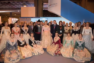 Un total de once falleras mayores de Valencia han desfilado en la Feria Internacional del Turismo (Fitur) de Madrid para promocionar las Fallas y el tradicional tejido de la indumentaria valenciana como reclamo ante los visitantes del certamen.